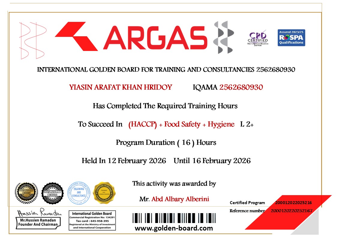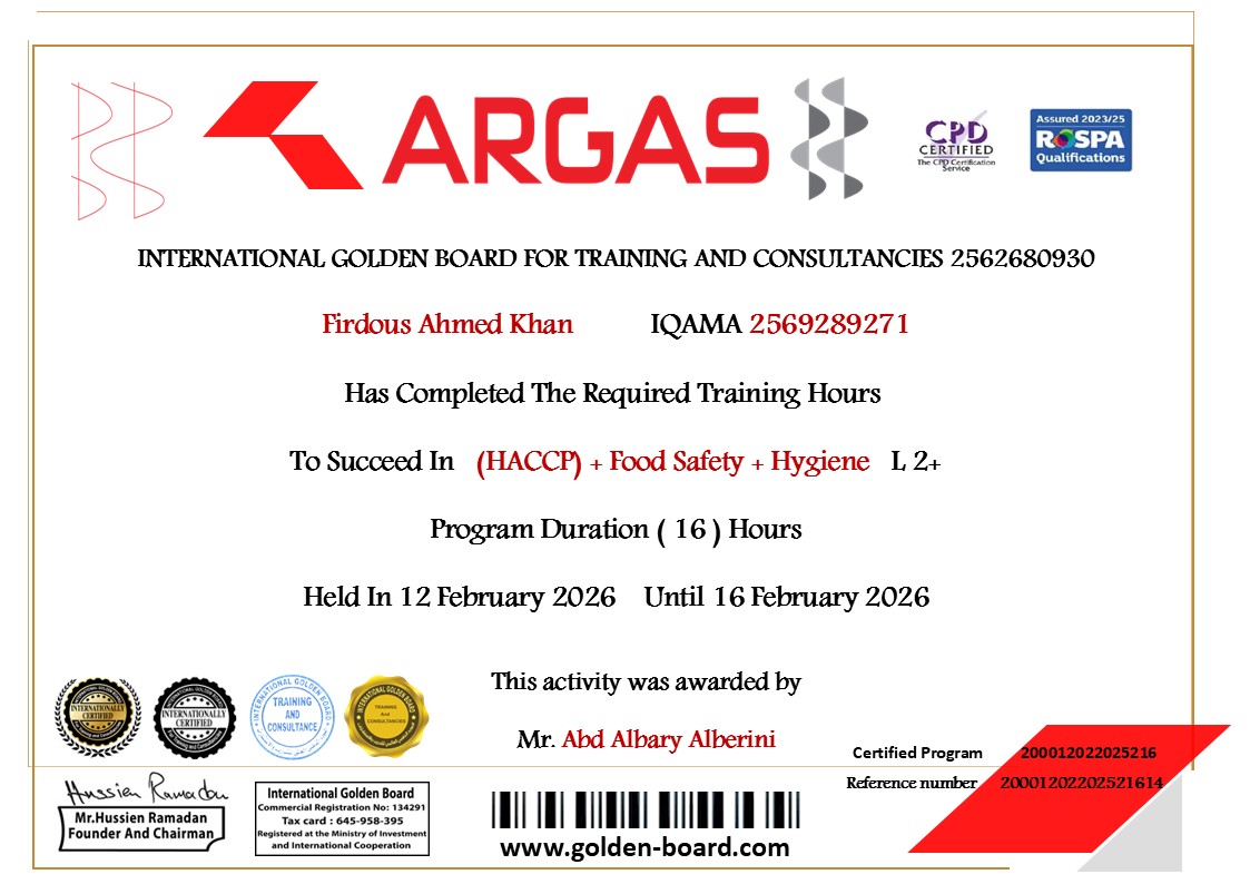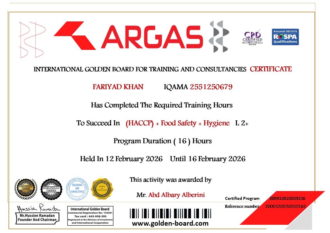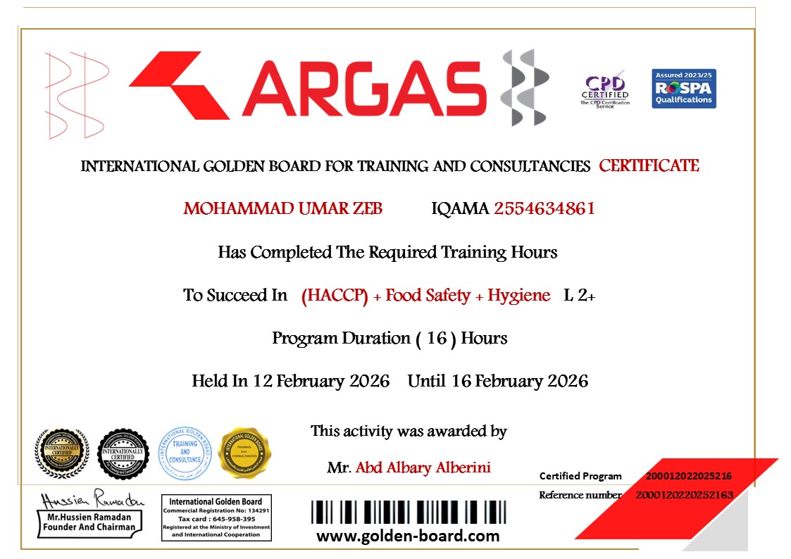 المدرب عبدالباري سليم عبدالحميد البيريني Food Safety Hygiene HACCP 3-2026 Rakibul Shaikh Firdous Ahmed Khan SALMAN KHAN Fathat Naji AL HASSAN MOHAMAD A SALM AMR Ibrahim Ahmed Saleh LITON MIA MD RAMZAN ALI YIASIN ARAFAT KHAN HRIDOY MD ELEAS KHAN MD MASUD RANA NASER MD NAZRUL ISLAM MOHAMMAD UMAR ZEB FARIYAD KHAN SURESH KATHAT